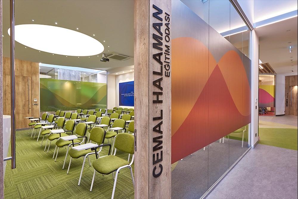 Departmanlarda fonksiyona yönelik ayrı ayrı çalışma birimleri oluşturuldu. Her departman için farklı ve canlı renkler kullanıldı. Çalışan tüm personel için kişiye özel dolap sistemi düşünüldü. Yönetim Kurulu toplantı odasını dairesel formda planlayarak departmanları farklı formlarda birbiri içerisine yerleştirerek, arada kalan alanlarda da sosyal mekanlar oluşturuldu. Bu farklı formları gerek tavanlara gerekse de mobilyalara yansıtarak mekanda kendi içindeki üç boyut etkisini daha da vurgulamak istendi. Ayrıca mekanda gün ışığının oluşturduğu iki sirkülasyon aksına paralel yerleşen departmanlar arasında toplantı odasını eğitim & seminer odası , cafe ve dilenme alanını yerleştirerek, ofis alanları ile bu alanlar arasında doğrudan bir ilişki kurgulandı. Yönetici odalarında mermer, doğal ahşap ve metal gibi doğal malzemelere ve daha yalın bir çizgiye ağırlık vererek sadeliği ön plana taşımak hedeflendi. Her yöneticinin kendi odası ile beraber dinlenme odaları da planlandı. Ayrıca tüm ofis duvarlarına tasarlanan panolarda ve bölücü camlarda, birbirine akışkanlık sağlayan görsel grafik çalışmaları düşünüldü. Renkli, enerjisi yüksek mekanın fonksiyonuna uygun, akıcı ve grafik çalışmalar kullanıldı. Yemekhane bölümünde birbirinden farklı alanlar oluşturuldu. Aydınlatmalar, oturma grupları zemin kaplamalarında farklılıklar oluşturarak çalışma ekibinin motivasyonunu arttırmak hedeflendi.