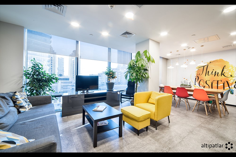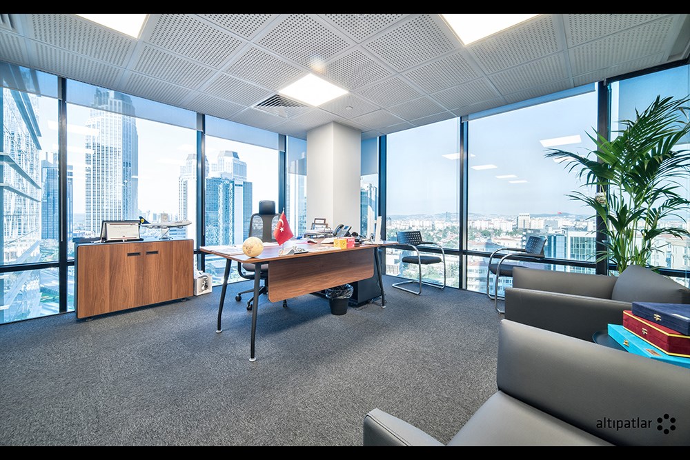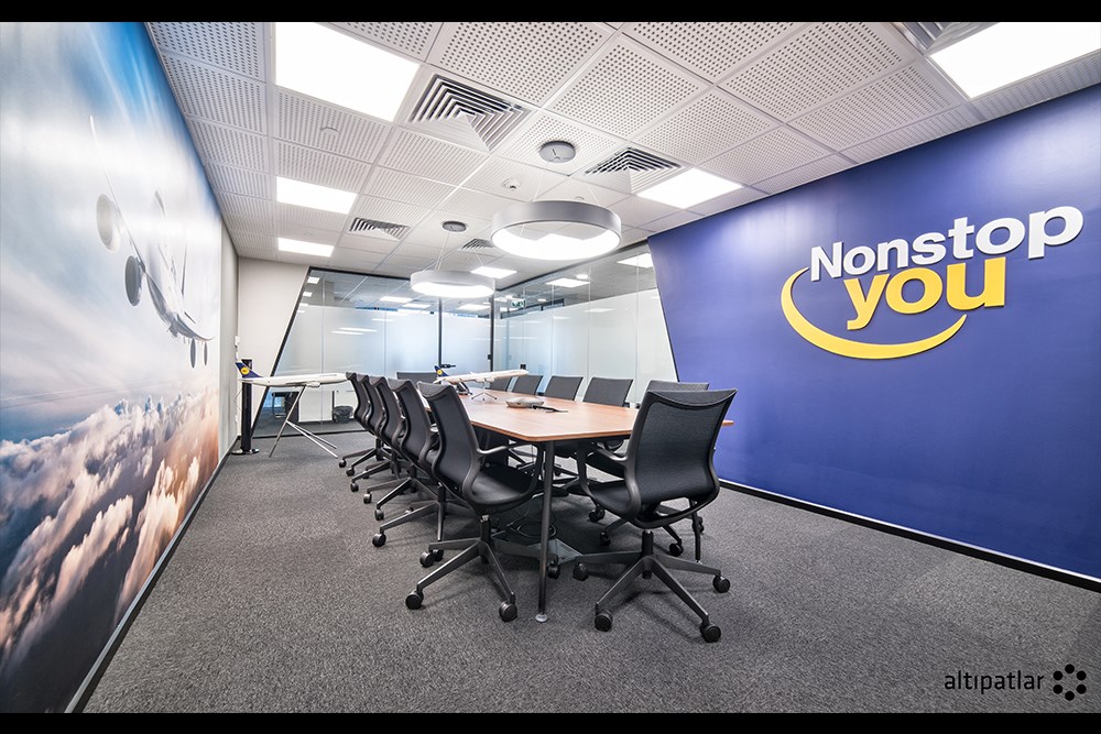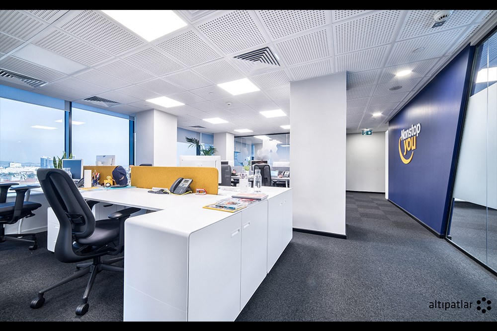 Avrupa’nın ve dünyanın en büyük hayayolları firmalarından biri olan LUFTHANSA Havayolları’nın Levent- Apa Giz Plaza’daki ofisi, firmanın Türkiye’deki Genel Müdürlüğü olarak hizmet vermektedir. İç mekan tasarımı Altıpatlar Mimarlık tarafından yapılan mekan; toplantı odası, yönetici ve departman ofisleri, sosyal alan-mutfak ve satış alanı olarak bölümlendirilmiştir. Projenin genelinde Lufthansa firmasının armasından ve uçaklarından esinlenilen tasarımlara yer verilmiştir. Gerek giriş bankosunda, gerek satış personelinin masalarında bu tür motiflere yer verilmiştir. Mekanda çoğunlukla armanın kendi renkleri olan koyu maviyi ve sarıyı duvarlarda, kolon kaplamalarda, doğramalardaki sticklerlarda ve grafik görsellerde kullanmayı tercih eden mimarlık ofisi, görsellerde Lufthansa firmasını öne çıkaran özelliklerini kullanmaya öncelik vermiştir.