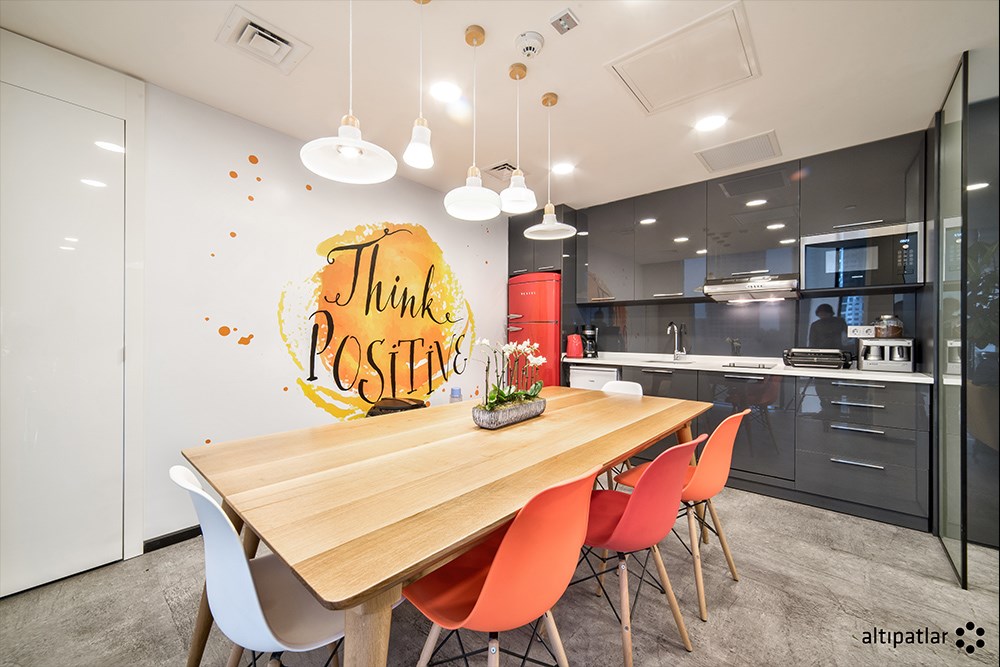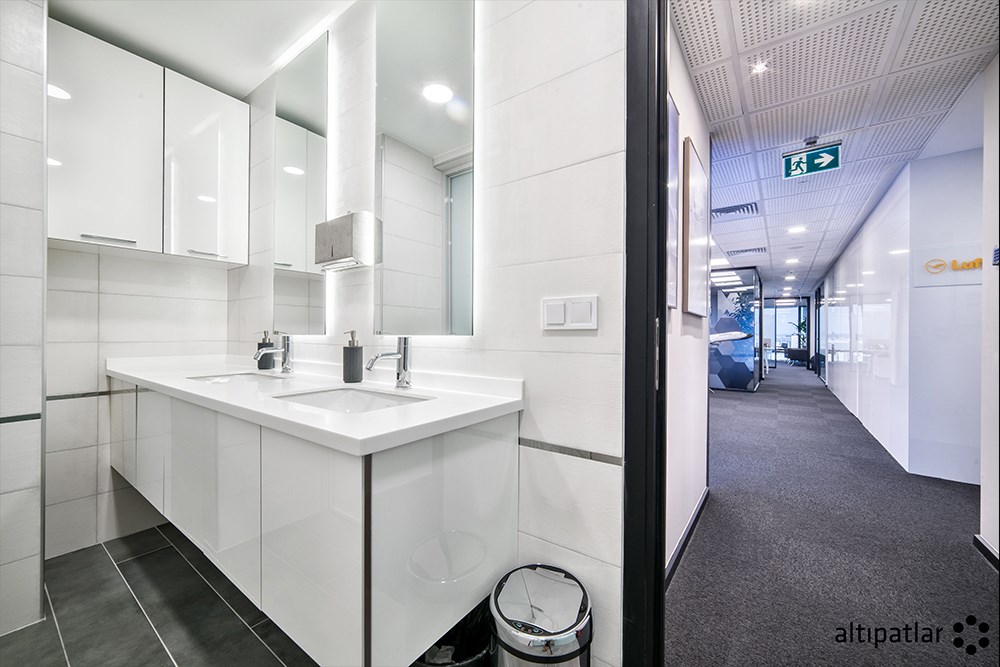 Giriş bankosunu ve lobiyi beyaz elementlerle daha sıcak bir karşılama hissi yaratmasının hedeflendiği projede, Lufthansa logosunu beyaz highgloss paneller üzerine yerleştirip sarkıt aydınlatma kullanarak ortam aydınlatılmıştır. Ofis içinde ferah bir hava yaratabilmek adına beyaz masalar tercih edilmiş ve bu masalara Lufthansa firma renklerinde kumaş seperatörler yerleştirilmiştir. Masa allarında personelin kullanbileceği hareketli kesonlar koyulmuş, sosyal alan ve mutfak kısmını ev ortamı hissi yaratacak sadelikte tutup, mutfak dolaplarında antrasit parlak lake tercih edilmiştir.
