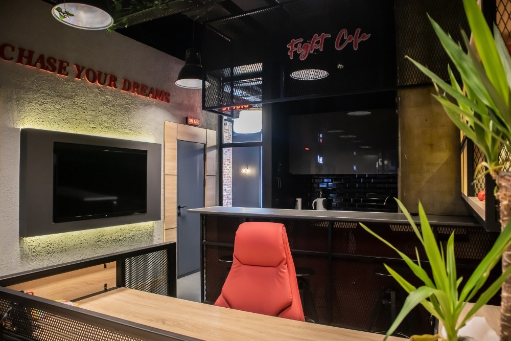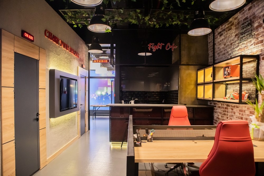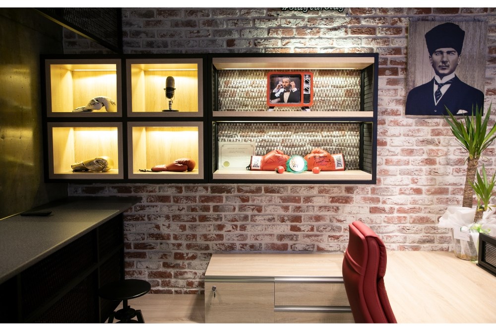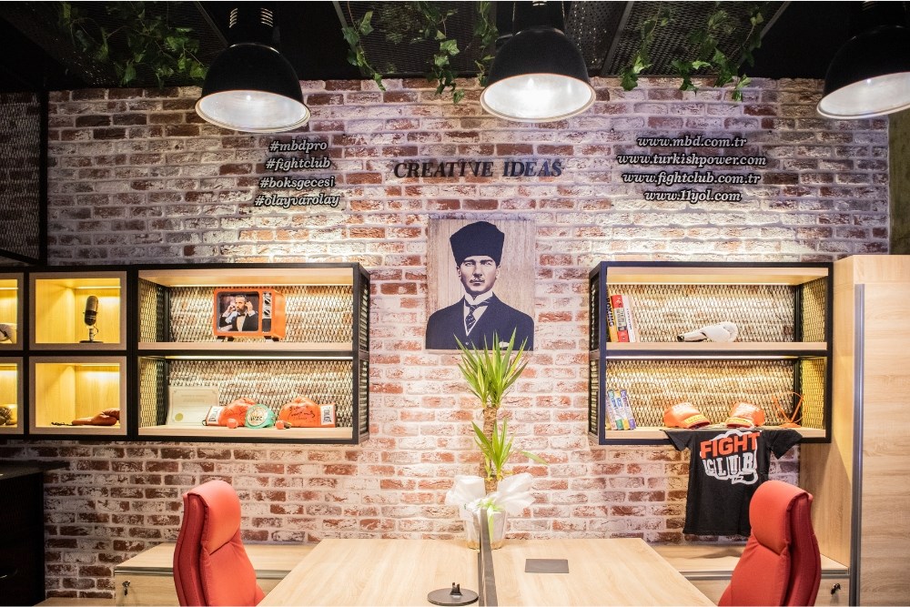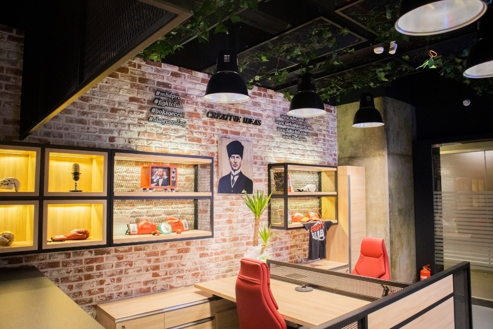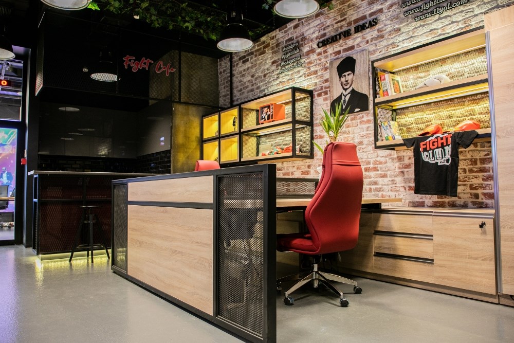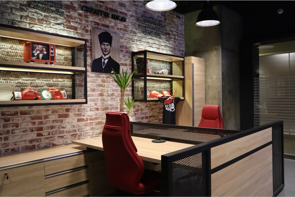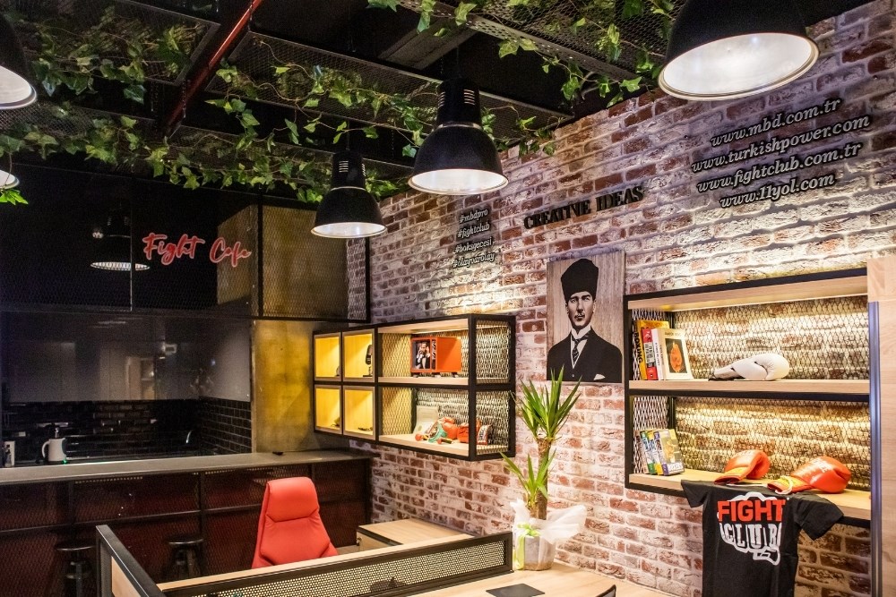 Projede kullanılan endüstriyel mobilyalar, işlevselliği estetikle birleştirerek mekânın kullanımının optimize edilmesini sağlamıştır. Aynı zamanda, mekânın karakterini vurgulamak adına duvarlara yerleştirilen yazılarla desteklenmiştir. Duvarlarda tercih edilen tuğla dokusu ise ambiyansın zenginleştirilmesine katkı sağlarken mekâna özgün bir atmosfer kazandırmıştır.
