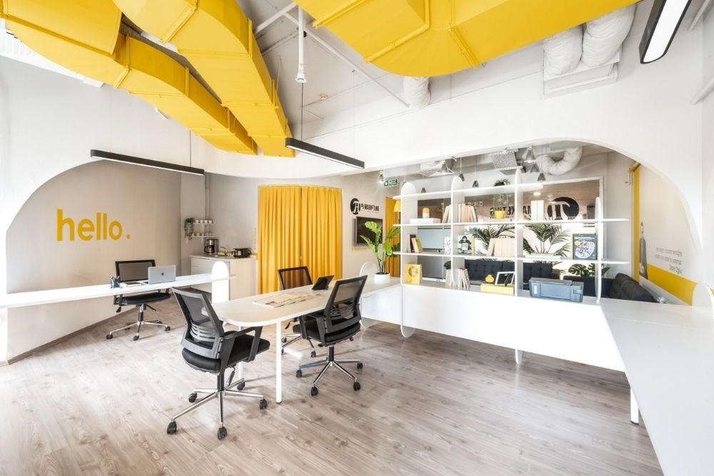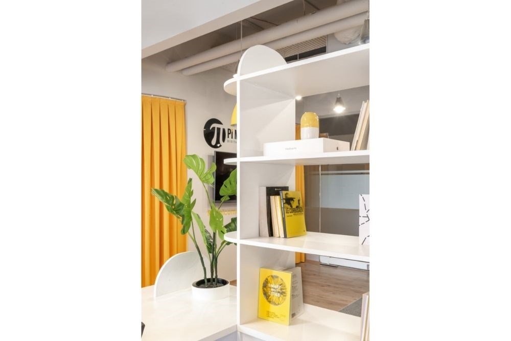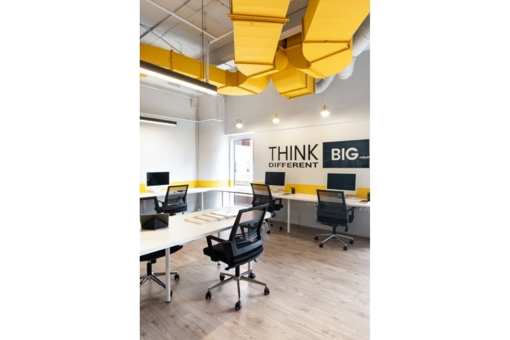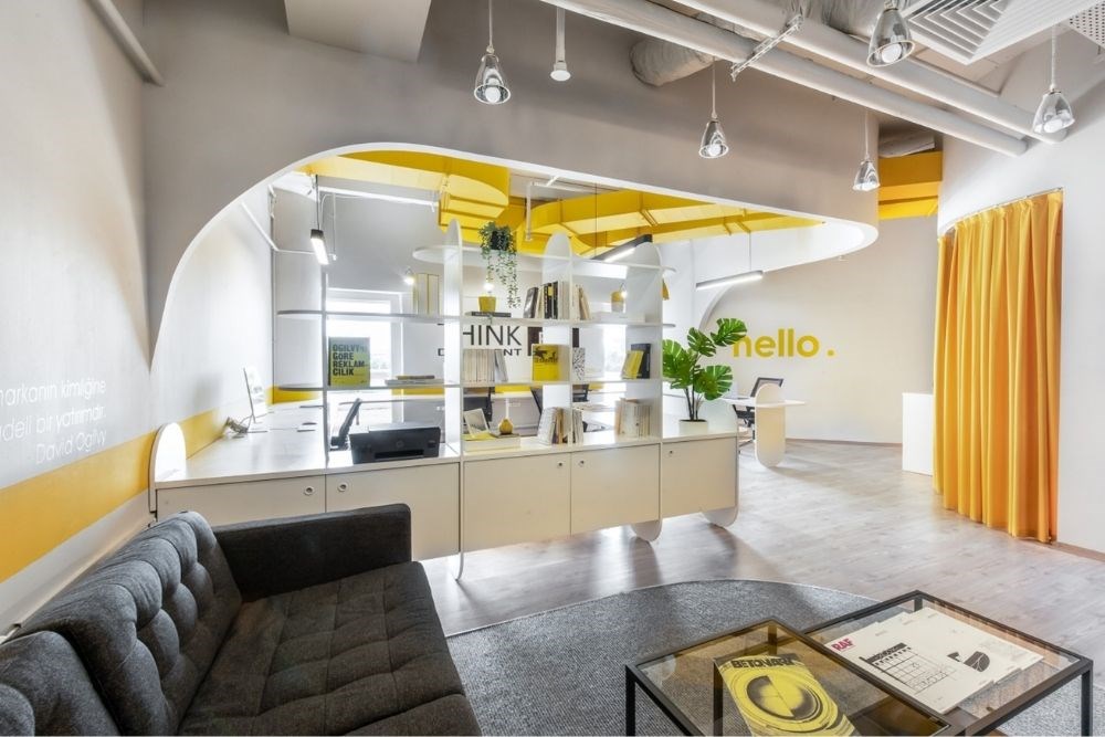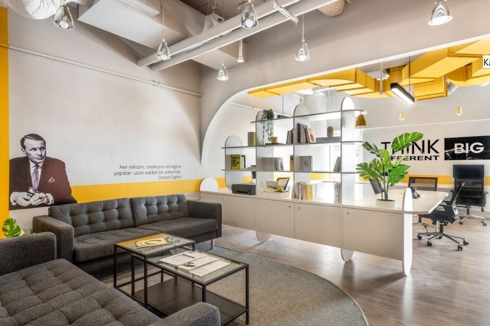 Çalışma alanı, çeşitli çalışan sayısı ve kullanım şekline hizmet eden devamlı lineer bir masadan oluşmaktadır. Monokrom renk şeması ile birlikte yaratıcılığın rengi olan sarı baskın bir şekilde kullanılmıştır.