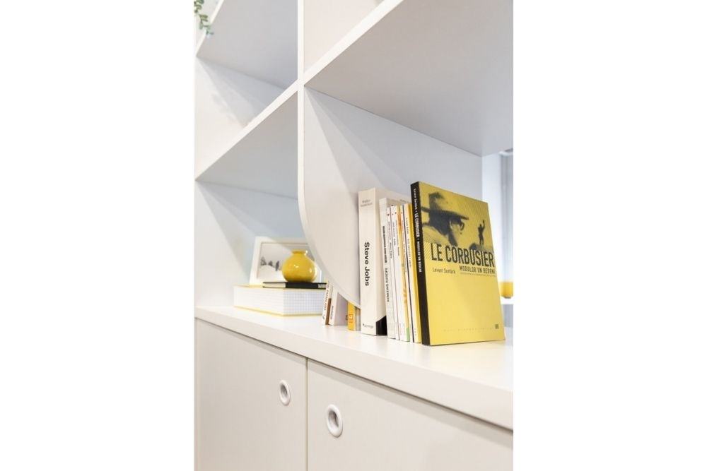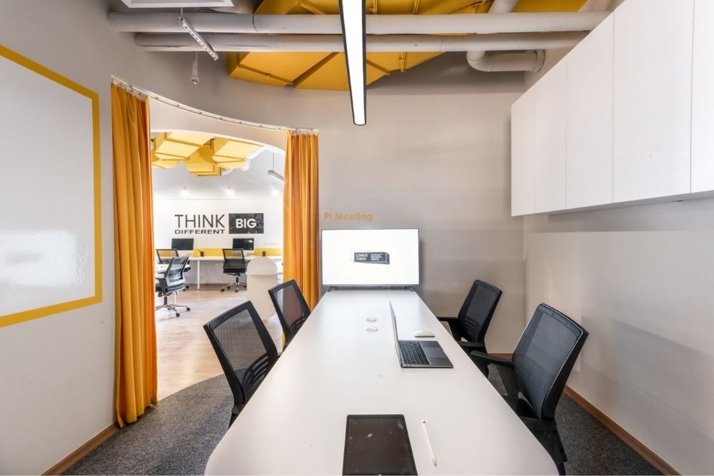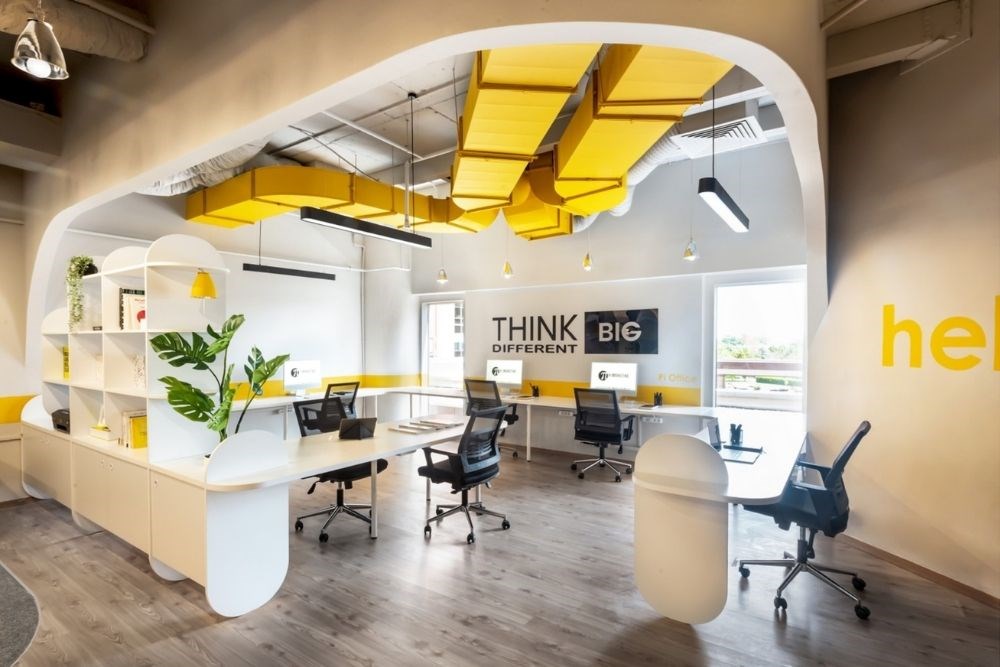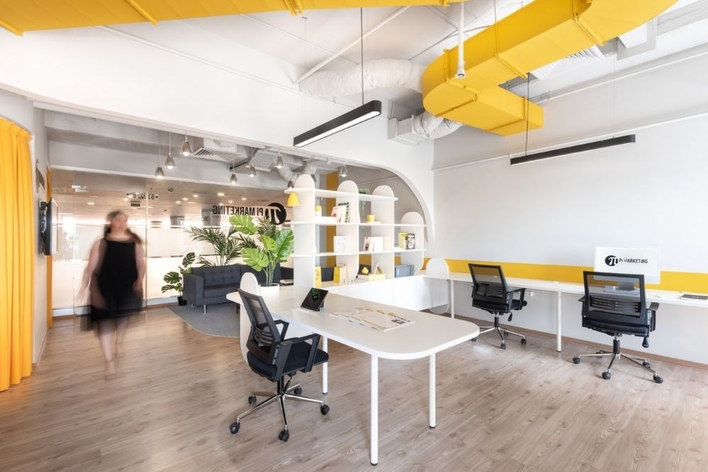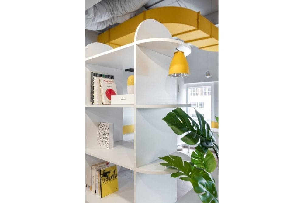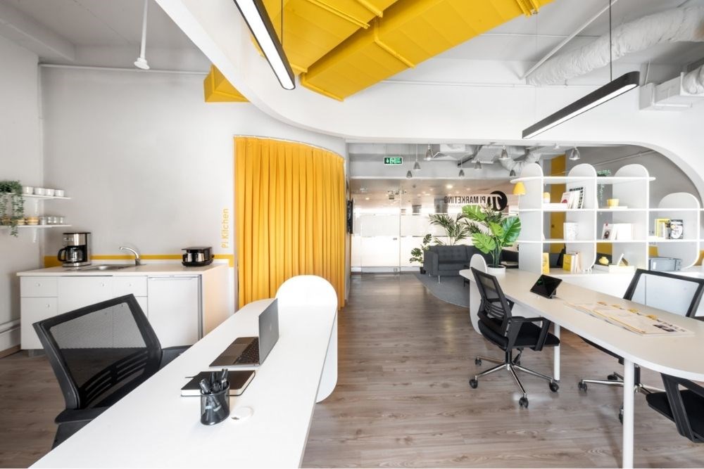 Çalışma alanı, çeşitli çalışan sayısı ve kullanım şekline hizmet eden devamlı lineer bir masadan oluşmaktadır. Monokrom renk şeması ile birlikte yaratıcılığın rengi olan sarı baskın bir şekilde kullanılmıştır.