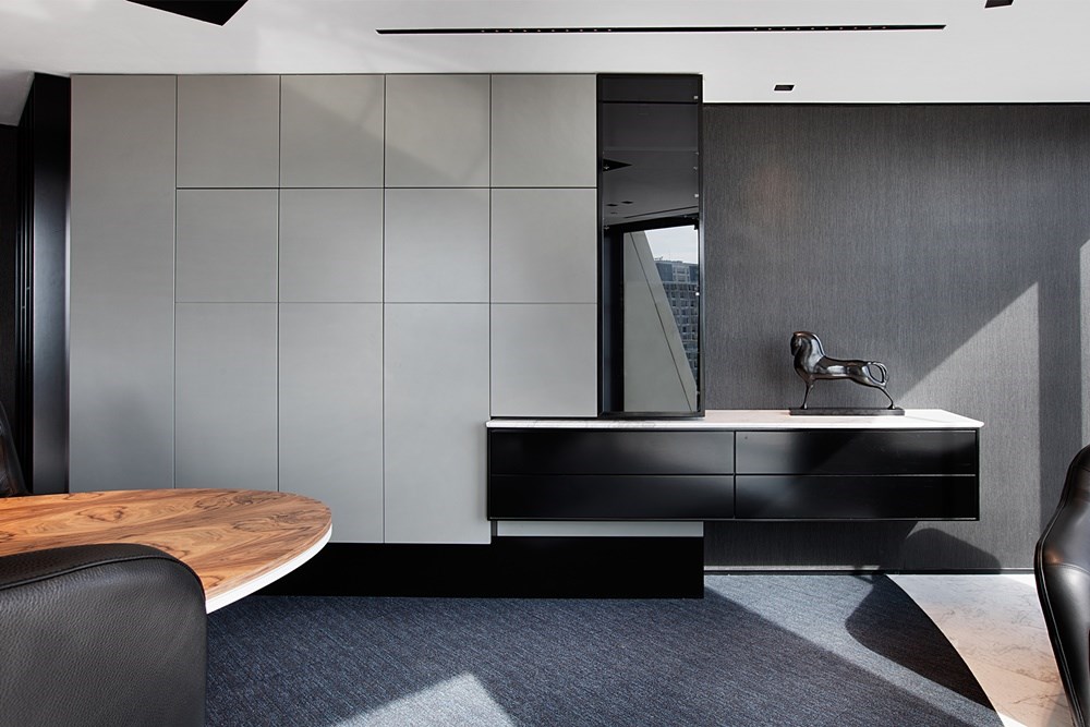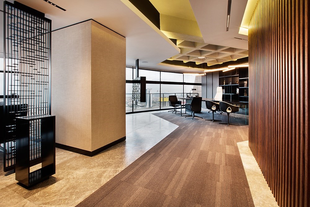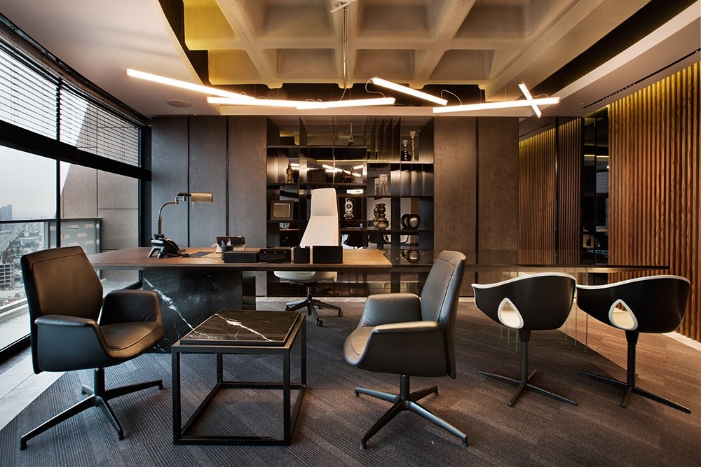 Yönetim Kurulu Başkanı’nın kullanımına ayrılan katta, çalışma alanı, misafir salonu ve dinlenme alanları açık ve şeffaf geçişler ile bir bütün olarak ele alınmıştır. Bu görsel bütünlük, uyumlu ve yalın malzeme seçimleri ile sağlanmıştır. Çeşitli renk ve dokularda aksesuarlar ve yardımcı tasarım elemanları ile mekanlar farklılaştırılmıştır. Mekana dair çağdaş tasarım çizgisi korunarak derinlik algısı arttırılmıştır. Çalışma alanında, tavan açık bırakılarak betonarme kaset döşemenin aykırı duruşu vurgulanmış ve maksimum yükseklik ile ferah bir ortam sağlanmıştır. Yönetim Kurulu Başkanı için tasarlanan 4 metre uzunluğundaki masa, verimli çalışma imkanı sunarken anlık toplantılar için de pratik bir kullanım sağlamıştır. Mekanda kullanılan baskın malzemeler, bu masanın bileşenlerinden oluşturulmuştur.