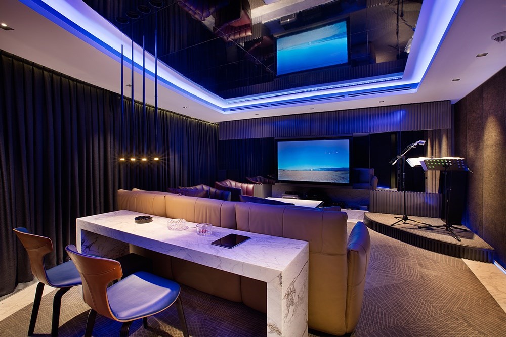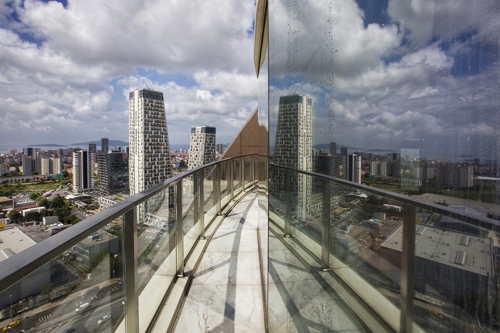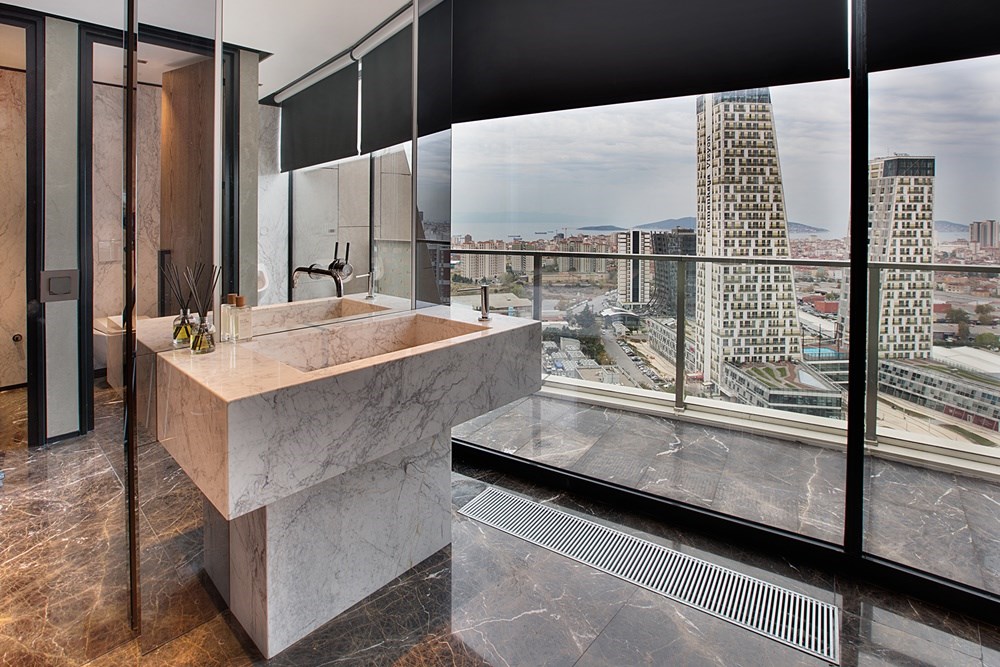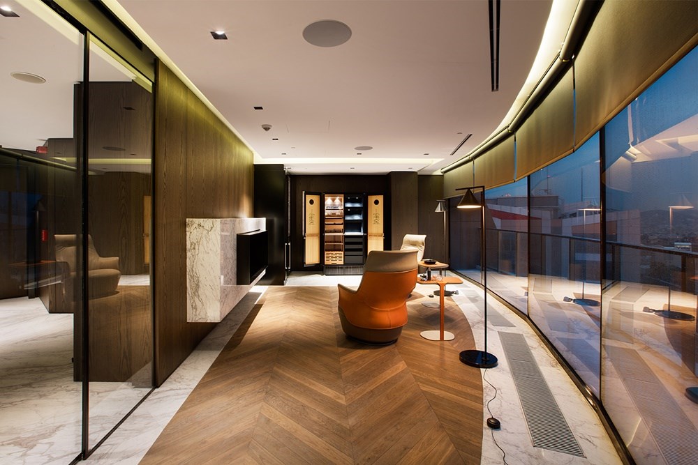 Kulenin son katında yer alan lobi alanı, puro odası, lounge alanı ve servis alanı gibi özel mekanların tasarımında, diğer katların seçkin tavrı ve üst düzey konfor anlayışı devam ettirilmiştir. Giriş ve lobi bölümünde kullanılan yansıtıcı düşey yüzeyler, koyu renk ahşap panolar ve zeminde kullanılan Calacatta mermer ile mekanda sofistike bir estetik oluşturulmuştur. Puro odasında, Calacatta ve masif parke zeminde birleşirken, duvardaki ahşap panoya eşlik eden Calacatta çerçeveli konsol, likit şömine ünitesi ile zenginleştirilmiştir. Adalar manzarasının keyfini artırmak için oturma düzeni şömineye göre şekillendirilmiştir. Servis dolabında kullanılan siyah lake ve füme cam, belirginliği azaltırken Buben&Zorweg Humidor, odanın odak noktası haline getirilmiştir.