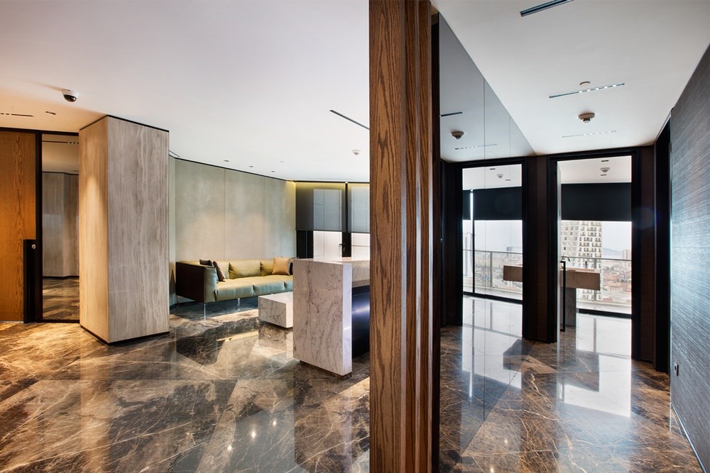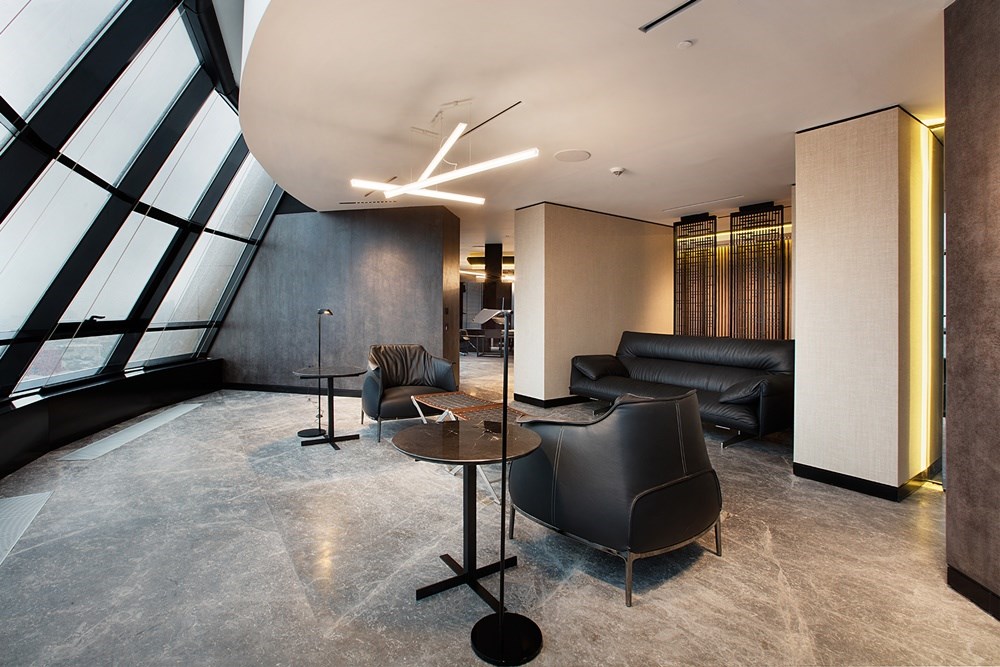 Safi Holding Merkez Ofisi’nin iç mekan düzenlemesi; geniş malzeme yelpazesi, keskin geçişleri ve yalın dokunuşları ile zamansız bir estetik anlayışını yansıtmıştır. Bu anlayış tasarıma; geçici bir görünümden uzak, kalıcı ve sofistike bir estetik kazandırmıştır.