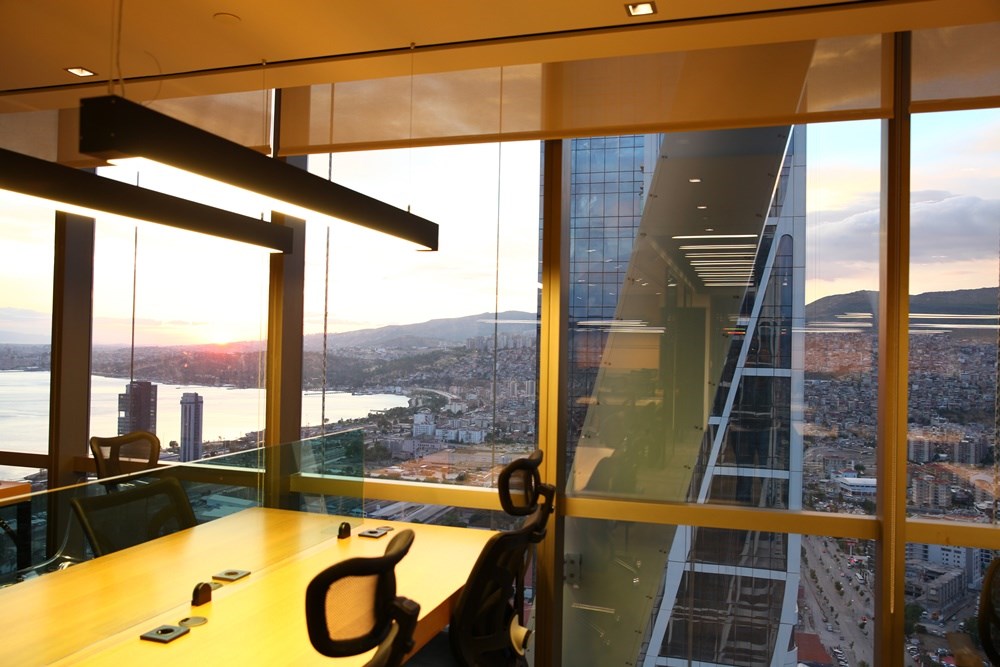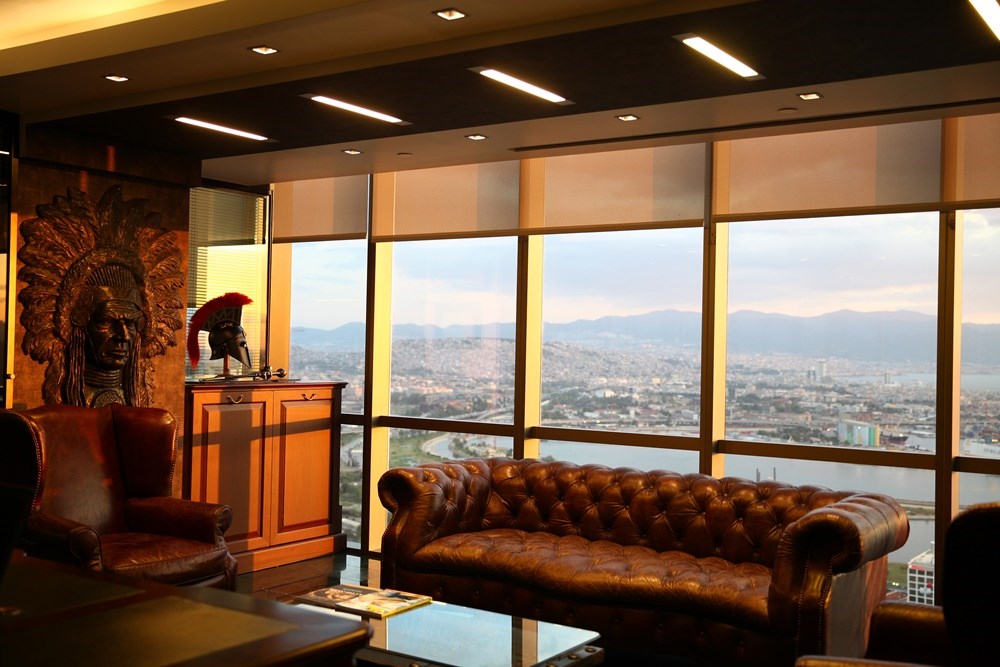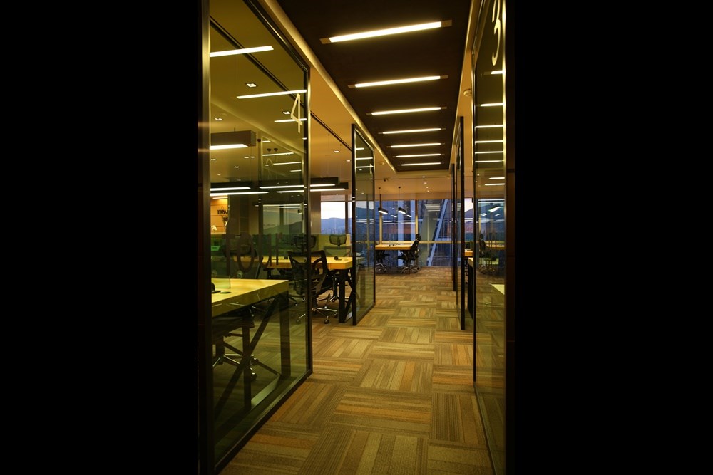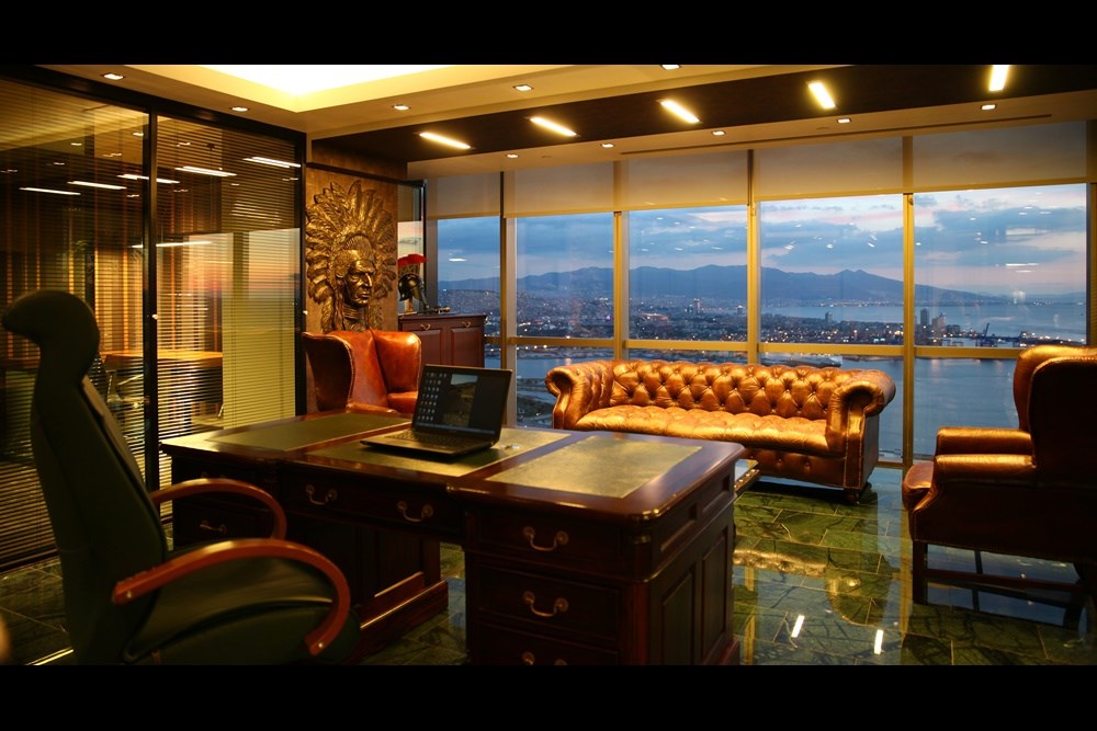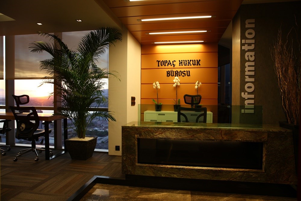 İzmir Folkart Towers B Kule’de bulunan Topaç Hukuk Bürosu, dört ayrı ofis birleştirilerek 300m²’lik tek bir ofis olarak tasarlanmıştır. Personel sayısının yüksek olduğu ofiste, fonksiyonellik ve estetik birlikte düşünülmüştür. Çoğunluğu açık ofis olarak uygulanan projede, personel ve yönetici alanlarının görsel ilişkisi kopmayacak şekilde şeffaf bölmeler, mekan sınırlarını belirlemek için kullanılmıştır. Yalın ve düz hatlara sahip olan mobilyalar ile mekana sadelik ve işlevsellik sağlanmıştır. Depolama alanlarında kullanılan siyah boyalı cam, mekana derinlik kazandırmıştır. Sirkülasyonun yoğun olduğu alanlarda karo halı tercih edilirken, yönetici odasında mermer zemin kullanılmıştır. Açık ofis içerisindeki dolaşım akslarını kuvvetlendirmek adına, tavanda yapılan farklı uygulamalarla görsel bütünlük sağlanmıştır. Genel ofis alanında modernizm etkili olurken, yönetici odasında klasik bir atmosfer yaratılmıştır.
