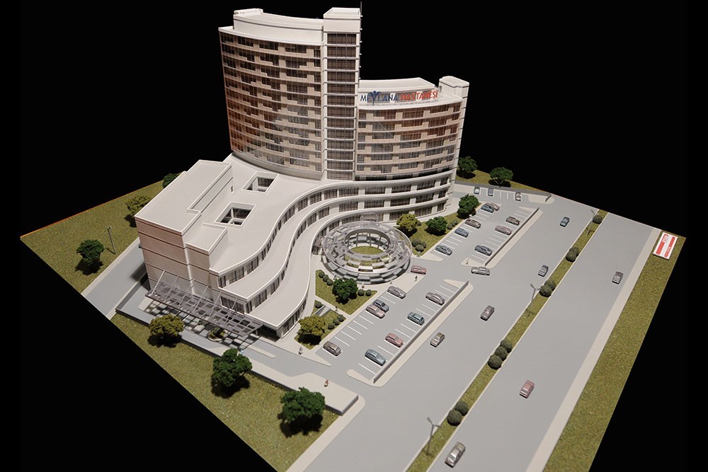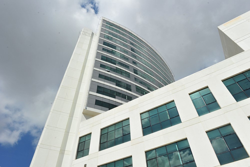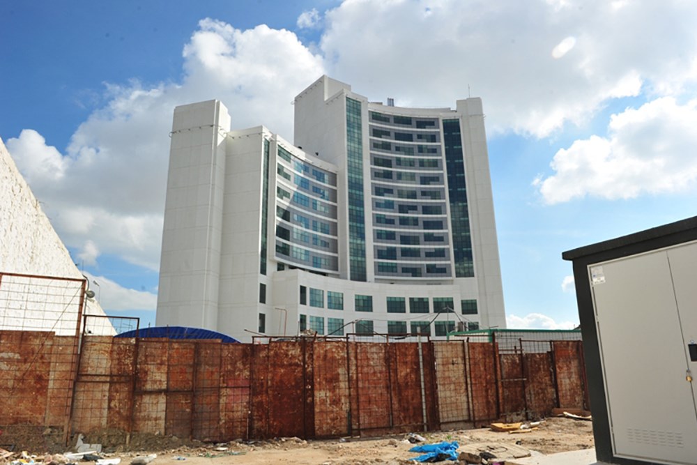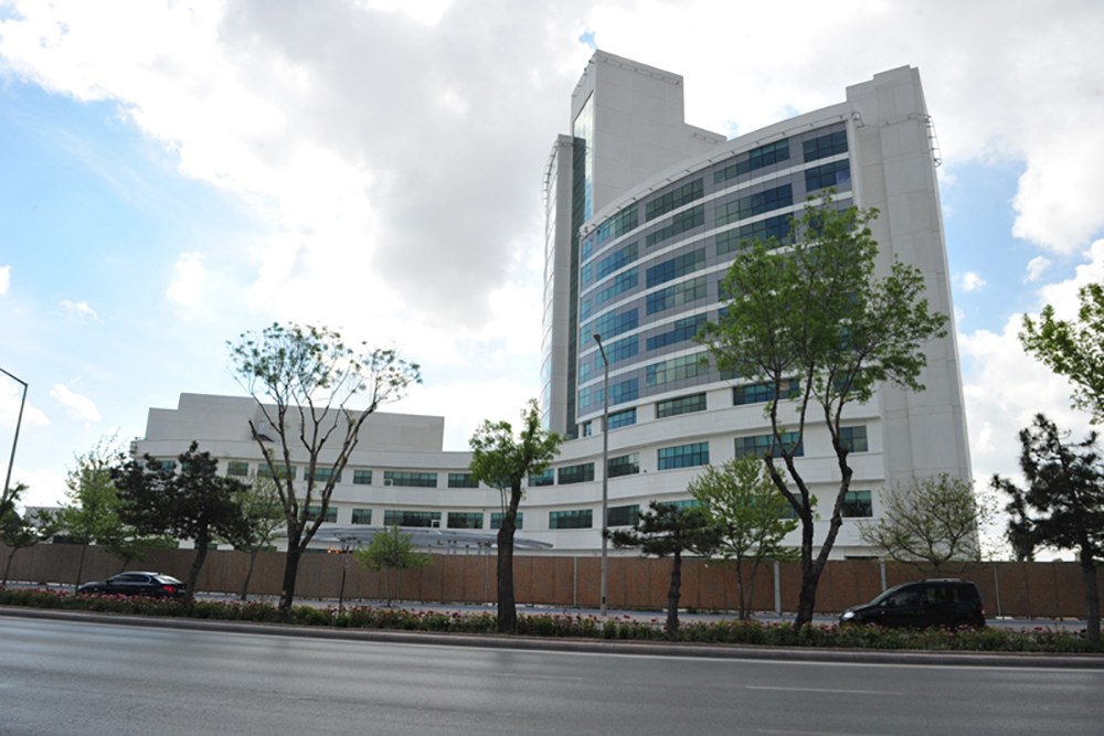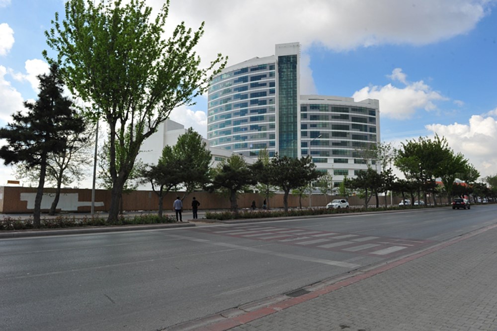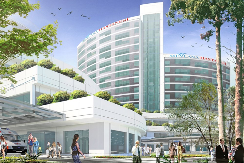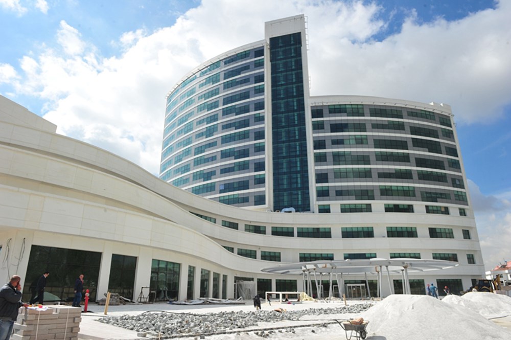 Doğu batı aksı boyunca uzanan ve bir yay şeklinde biçimlenen yüksek katlı bloğun yoldan uzakta olan doğu kanadı, yola yakın olan batı kanadından 4 kat daha yüksek tasarlanarak yol kotundan podyum binaya, podyum binadan kule binanın doğu kanadına, kule binanın doğu kanadından batı kanadına doğru kademeler yapılarak yol tarafında geniş bir açık alan ve hacim oluşturulmuştur.Burada yaratılan alan içinde açık otoparklar, yaya yolları, acil girişi, bina ana girişi, diyaliz girişi, acil durum çıkışları, kapalı otoparka yönelen rampa organize edilmiştir.Böylece daha sıcak ve sempatik oranlar yakalanmak istenmiştir.