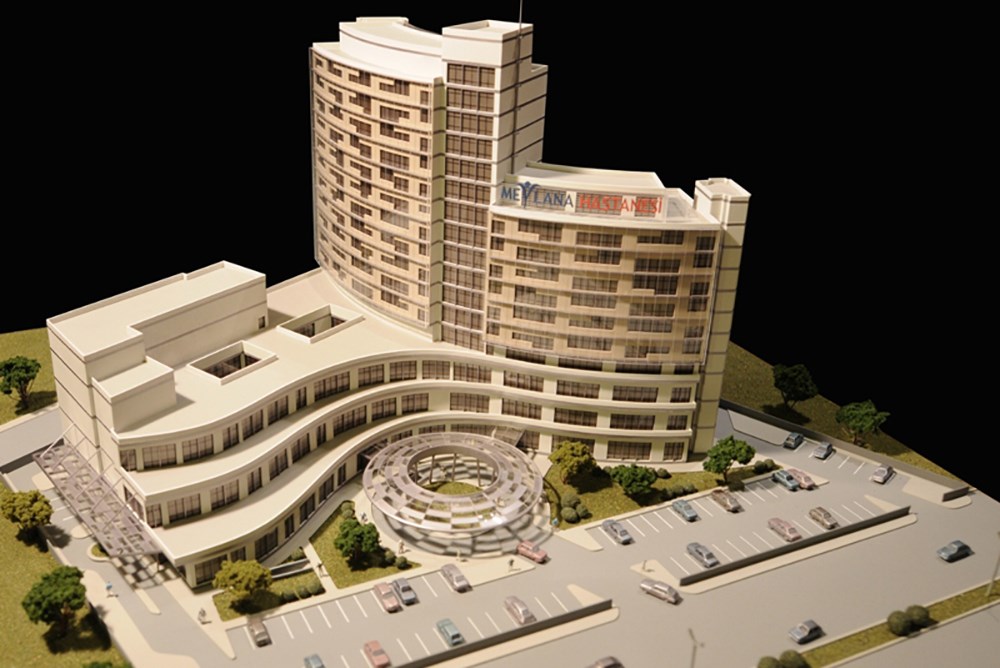 Zemin kat, 1.kat, 2.kat ve 3.katta ihtiyaç programı yoğunluğu nedeniyle çok yoğun mekan grupları yer almış, yaklaşık 3000m²-4000m² kapalı alandan oluşmuş 60mx40m ebatlarında yekpare kat planları ortaya çıkmıştır. Orta mekanların cephelerden uzak kalması nedeniyle 2 tane 8mx10m ebatlarında iç avlu yapılarak doğal ışık binanın ortasında ki, cephelerden uzak mekanlara ulaştırılmıştır. Ayakta hastanın (günübirlik hasta) hastaneyi ziyareti sırasında minimum iç trafik oluşacak şekilde mimari tasarım şekillendirilmiştir. Bu yüzden 2.bodrum kat, 1.bodrum kat, zemin kat, 1.kat ve 2.kat seviyelerinde arsanın verdiği imkanlar en sonuna kadar zorlanarak büyük alanlar yaratılmış ve günübirlik hastaların podyum binada düşey sirkülasyonuna imkan tanınmıştır. 2 parçalı kule binanın düşey sirkülasyon şaftı günübirlik hasta ve günübirlik hasta yakınlarının trafiğinden en az etkilenecek şekilde tasarlanmıştır. Bodrum katların dış konturları arsa yapı yanaşma sınırıyla bire bir aynı düşünülmüş, böylelikle arsanın verebileceği en geniş plan konturları elde edilmiştir. Bodrum katlarda doğal ışığa ihtiyaç duymayan mekanlar (ameliyathane, klinik laboratuar, radyoloji laboratuarı, nükleer onkoloji, merkezi sterilizasyon v.b.) tasarlanmıştır. Yine 2.bodrum kat ve 3.bodrum katta; sağlık tesislerinin en önemli unsurlarının başında gelen elektrik, mekanik alt yapılarıyla, bu mekanların ihtiyaç duyduğu birimler ve hastanenin önemli servis birimlerinden çamaşırhane, bay personel soyunma odaları, bayan personel soyunma odaları, depo ve atölyeler, morg, atık merkezi v.b. konumlandırılmıştır. Doğal ışığa ihtiyaç duymayan bir diğer mekan grubu olan otoparklar da 2.ve 3.bodrum katlara yerleştirilmiştir. Kule binaya genel olarak hasta servisleri konumlandırılmıştır. Alt katlarda podyum binaya sığmayan poliklinik, lojman, kreş gibi destek birimleri de kule binaya yerleştirilmiştir.