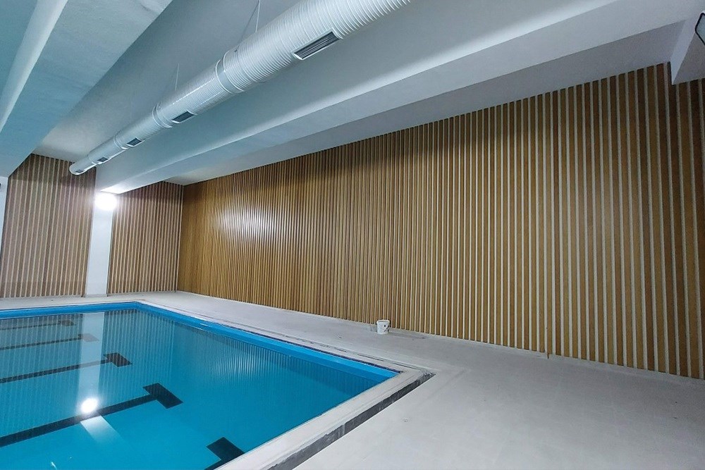 İç mekân tasarımında öne çıkan bu özel uygulama, ahşabın doğallığını modern çizgilerle buluşturarak kullanıcıya konforlu bir deneyim sağlıyor. Havuz çevresinde düzenli hatlara sahip dikey profiller, mekâna ritmik bir hareket kazandırırken akustik konforu da destekliyor.