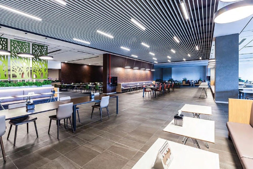 Çalışanlar için sosyal alanlarda ise, mekânın kurumsal kimliğine uygun olarak tavanda uçak motoru motifini oluşturmak amacıyla özel tasarım Plate ürünü kullanılmıştır. Ayrıca, farklı renklerdeki Baffle örnekleriyle canlı ve dinamik bir iç mekan tasarımı oluşturulmuştur.