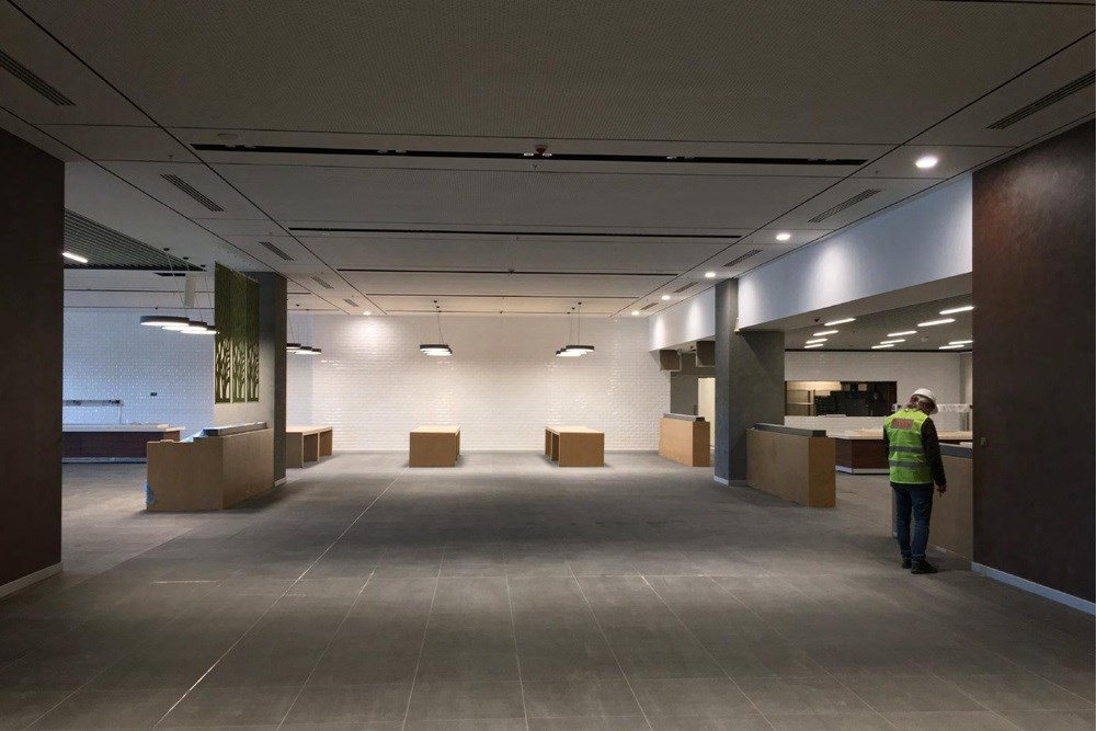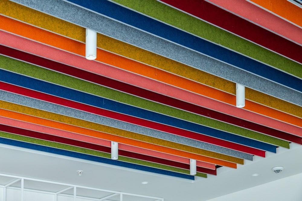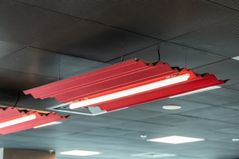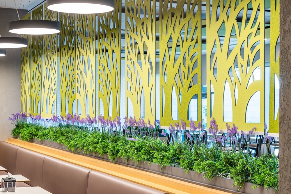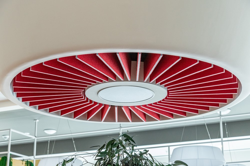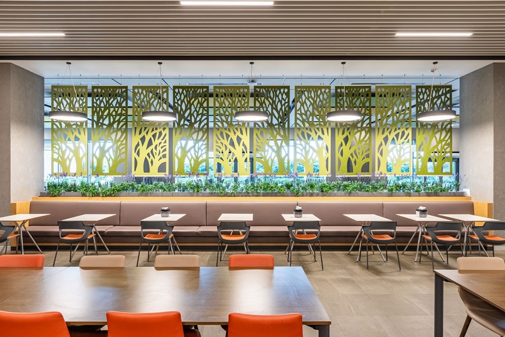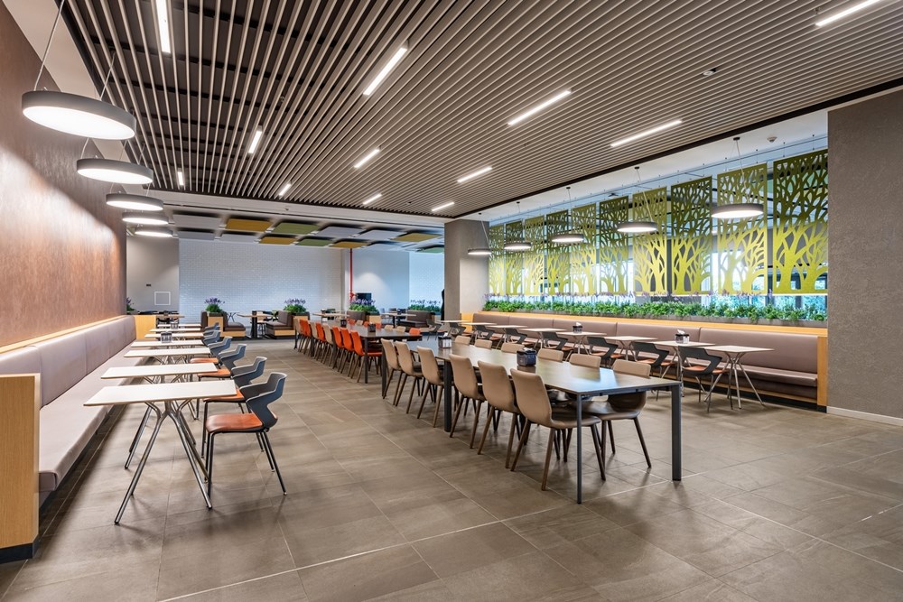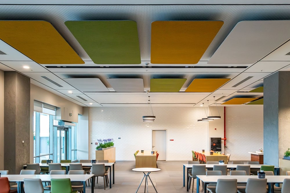 Ortak yemek alanında, çatal-bıçak seslerinden kaynaklanan yankı süreleri, tavana asılan Flat Cloud ve Mesh Forest ürünleriyle alanın bölünmesiyle azaltılmıştır.