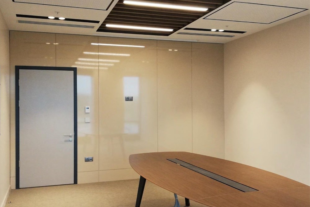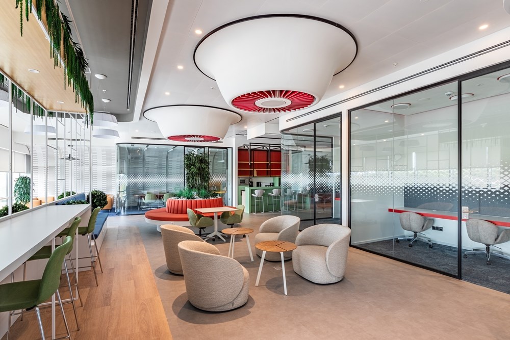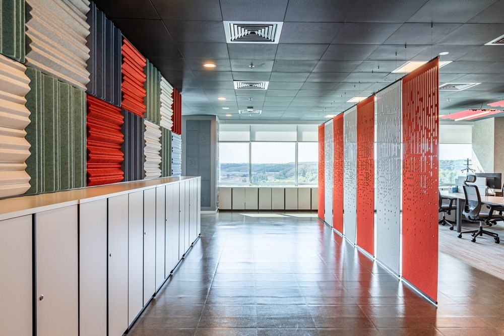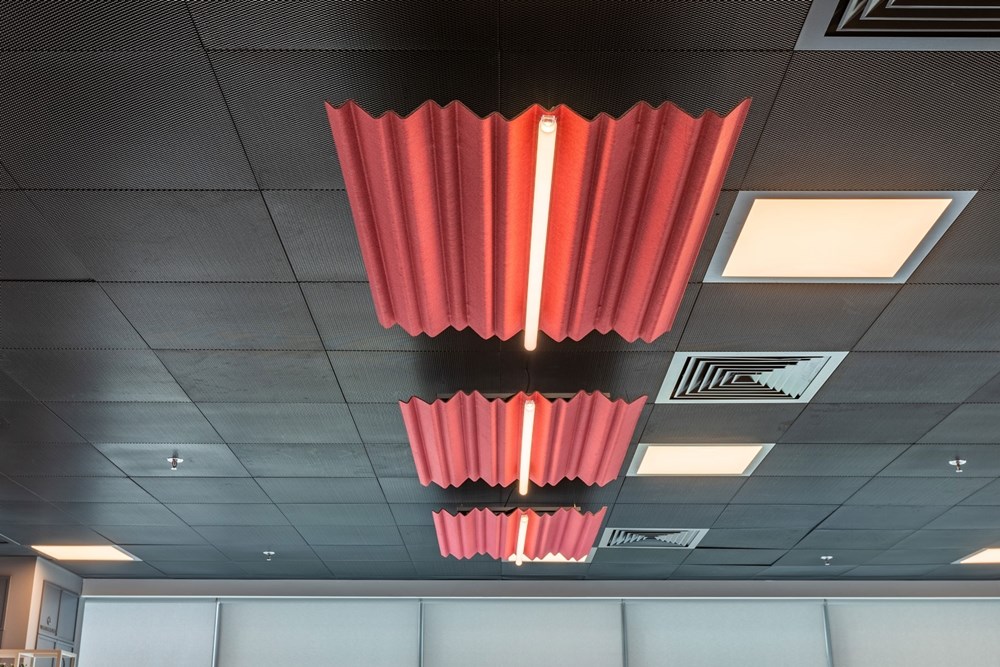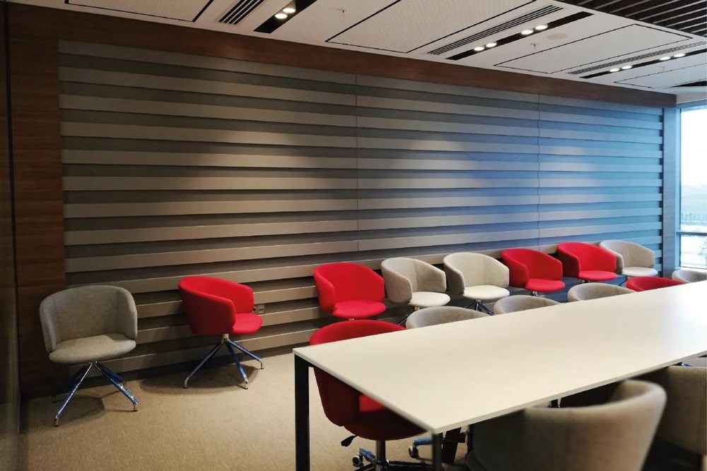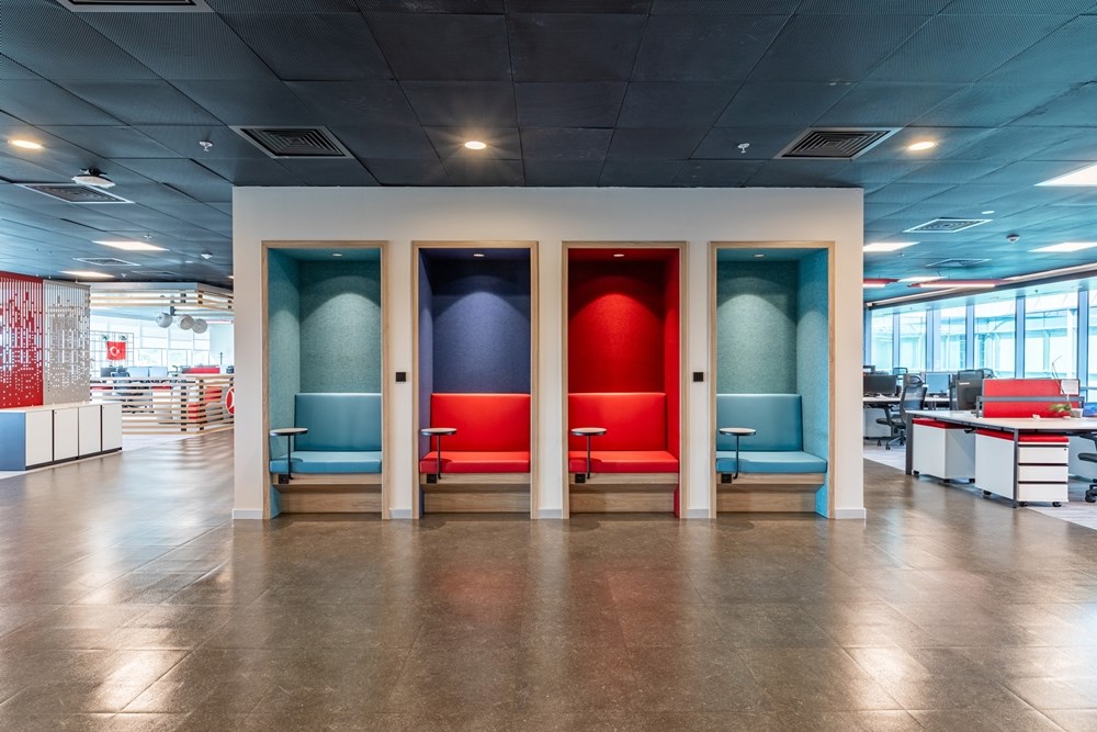 Üç katlı operasyon merkezinde, açık ofis çalışma alanlarında çok işlevlilik sağlayan duvar panelleri, asma elemanlar ve akustik aydınlatma çözümleri bir arada kullanılmıştır. Çalışma alanlarını koridorlardan ayırmak için tavandan Rain Mesh modeli asılırken, çalışma istasyonları için Cracker Cloud Aydınlatma ürünü tercih edilmiştir.