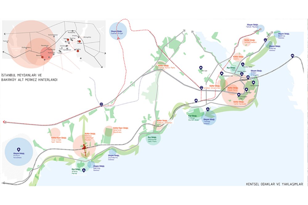 Bakırköy Cumhuriyet Meydanı, kentin en yoğun ulaşım rotalarından biri olan E5 otoyoluna kuzey-güney aksında bağlanan İncirli Caddesi ile 19. yüzyıldan beri hizmet veren ve İstanbul’u doğu-batı yönünde kat eden demiryolu hattının birleşim noktasında bulunmaktadır. Aynı şekilde kıyı bandı boyunca devam eden yeşil doku üzerinde bulunan odaklar ile de ilişkilidir. Bu odakların kent içi ulaşım arterleri ile bağlantısını kuvvetlendirmek adına yarışma alanı bir ara kesit görevi görmektedir. Geçmişte taşıt yolu olarak kullanılan Fahri Korutürk ve Ebuzziya Caddeleri bu kıyı bandı odaklarının güçlü ulaşım akslarına bağlanmasında önemli rol üstlenmektedir. Bu bağlamda aslında yarışma alanı doğu-batı ve kuzey-güney yönünde kente hizmet eden farklı türdeki ulaşım yollarının tam merkezi kesişiminde bulunma özelliğine sahiptir. Bu çerçevede Bakırköy Meydanı ve yarışma alanı yakın çevresi ile birlikte ele alınmayı gerektirmektedir. Yarışma alanına dair ilk stratejiler alanın bu özelliklerine göre şekillendirilmiştir.