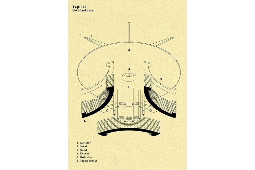 Yapı taşıyıcı sistemi betonarme kolonlara mesnetlenen ışınsal kirişler, bu ışınsal kirişleri merkezde birbirine bağlayan çember kiriş (kasnak), kirişlerin alt uçlarından içbükey formda oluşturulan betonarme bir kabuktan meydana gelmektedir.