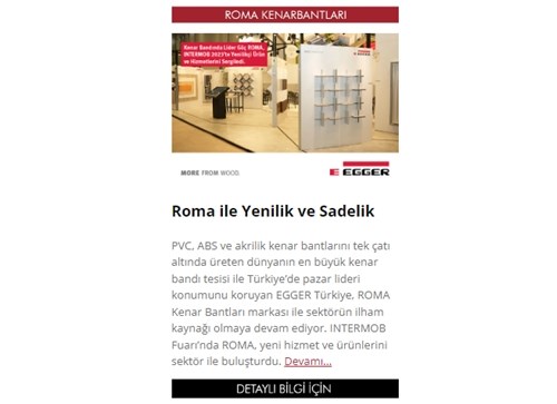 EGGER Türkiye, “Kenar Bandında Çözüm Ortağı” mottosu doğrultusunda ROMA Kenar Bantları markası ile kenar bandı sektöründe yatırımlarına devam ederken, dünya pazarındaki etkisini her geçen gün artırmaktadır. ROMA Kenar Bantları, kenar bandı markası olarak iç ve dış pazardaki konumunu üstün kalite prensibiyle güçlendirerek, gerek ürün çeşitliliği gerekse hizmetleriyle pazara çözüm odaklı hizmetler sunmaya devam etmektedir.