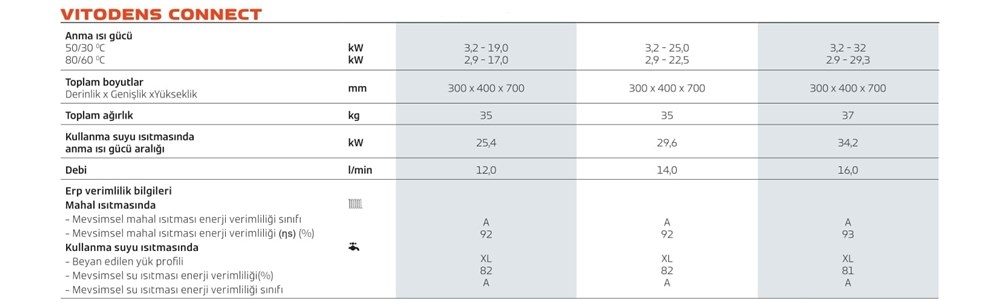 Vitodens Connect duvar tipi yoğuşmalı kombi, üstün kalitesi ile öne çıkmaktadır. Kapsamlı aksesuar seçenekleri ile hem yeni binalarda hem de mevcut ısıtma sistemlerinin modernizasyonunda kullanılabilir. Vitodens Connect, üç farklı kapasite aralığındaki (3,2 ila 19 kW, 3,2 ila 25 kW ve 3,2 ila 32 kW) kombi seçenekleriyle sunulmaktadır.
